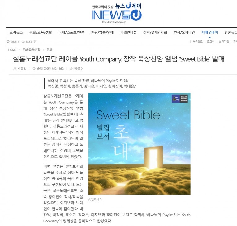 [기사] 샬롬노래선교단 레이블 Youth Company, 창작 묵상찬양 앨범 ‘Sweet Bible’ 발매(뉴스제이)