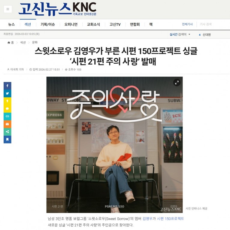 뮤직타임 [기사] 스윗소로우 김영우가 부른 시편 150프로젝트 싱글 ‘시편 21편 주의 사랑’ 발매(고신뉴스 KNC)