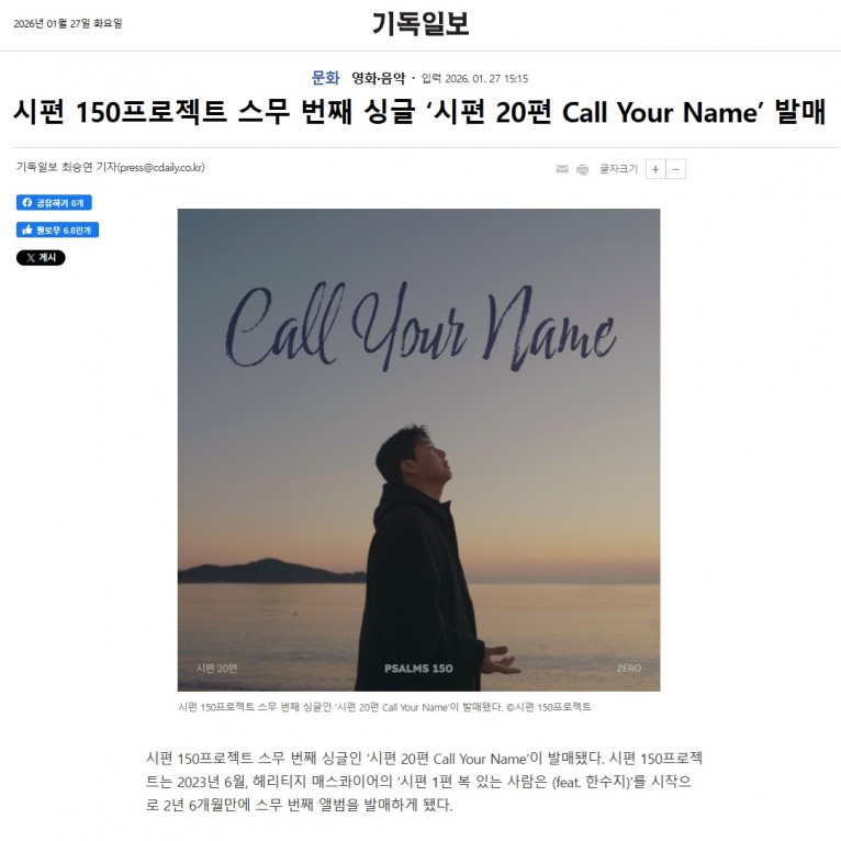 [기사] 시편 150프로젝트 스무 번째 싱글 ‘시편 20편 Call Your Name’ 발매(기독일보)