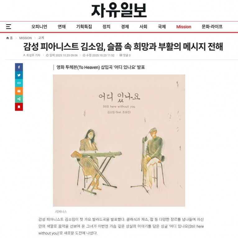 뮤직타임 [기사] 감성 피아니스트 김소임, 슬픔 속 희망과 부활의 메시지 전해(자유일보)